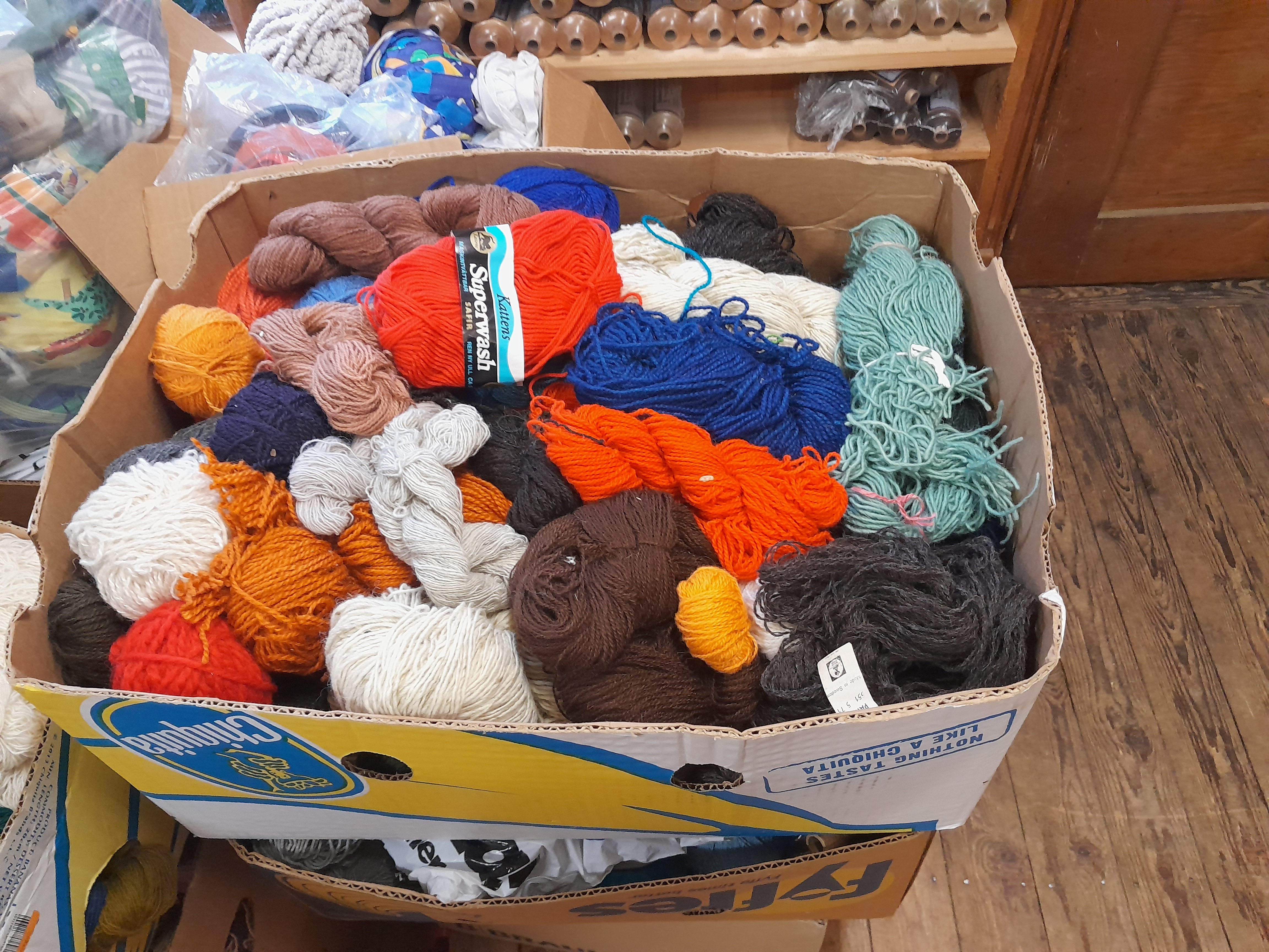 eine Bananenkiste mit Wollgarn |