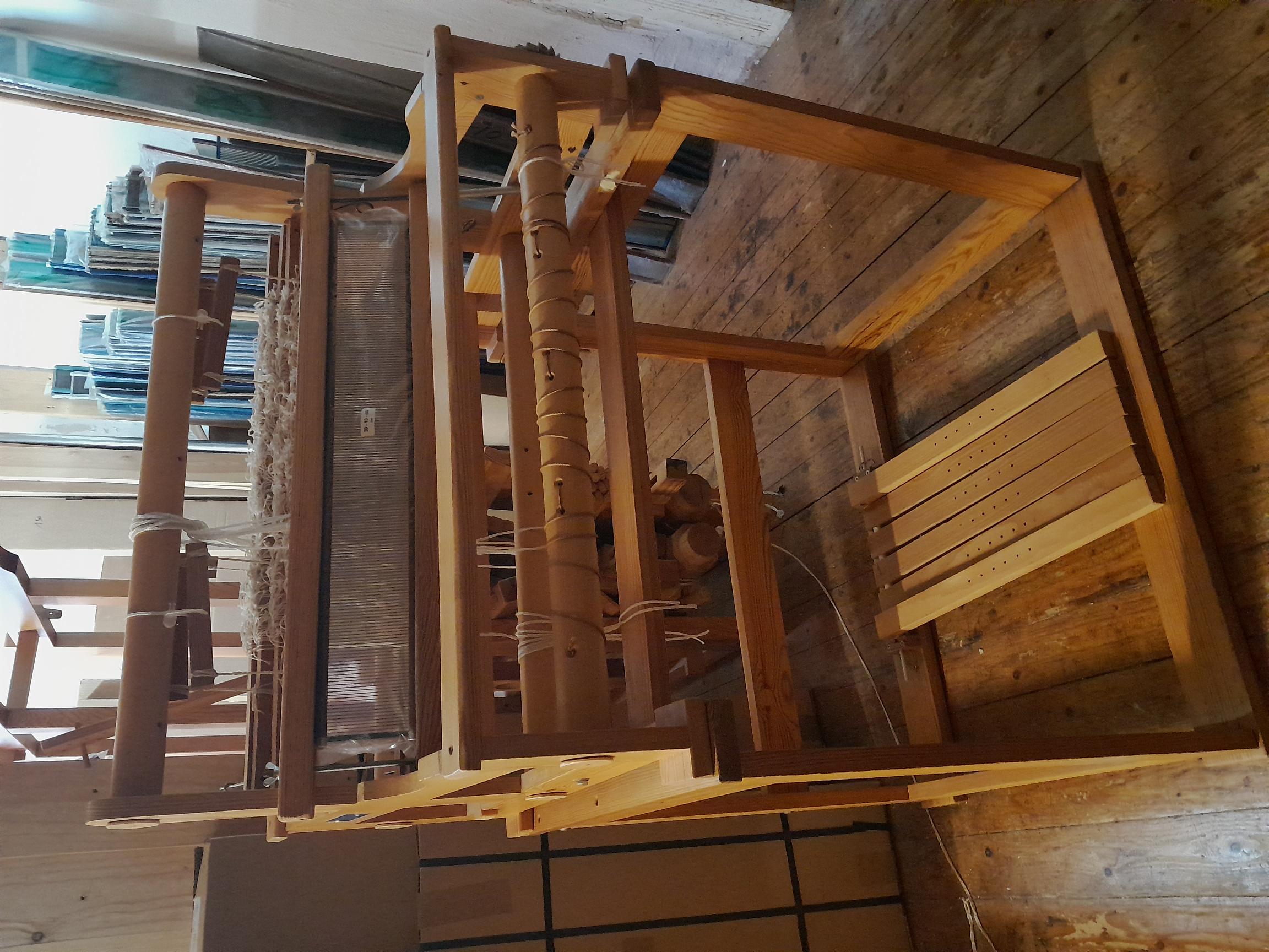 Webstuhl Öxabäck, WB 125 cm, Kontermarsch-Seitenzug, 12 Schäfte, Webstuhlverlängerung, Damasteinrichtung für 50 Musterschäfte, Webblatt, Litzen , Verschnürung, Sitzbank |